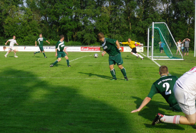 In der ersten Halbzeit gab es in diesem Krummhörn-Derby für die zahlreichen Zuschauer nur einen lauen Sommerkick zu sehen. Die Visquarder hatten gute Chancen, wussten diese aber nicht zu nutzen. Entweder scheiterten sie am eigenen Unvermögen oder am TV- Torhüter van der Ploeg. So gingen die Gastgeber mit einer etwas schmeichelhaften 1:0 Führung in die Kabine. Badu hatte mit der einzigen Chance für den Führungstreffer gesorgt.